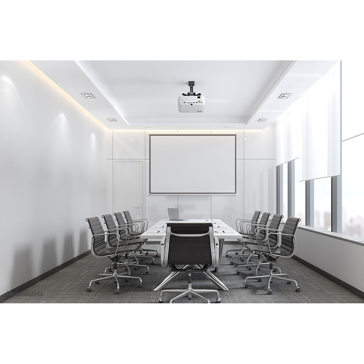 The Neomounts CL25-530BL1 is a universal ceiling mount for projectors designed to provide a solid, flexible, and secure installation in professional or home environments. Made in black, this mount stands out for its durability, supporting a maximum weight of up to 45 kg, ensuring compatibility with a wide range of projectors, including heavier models. Its design features four extendable arms allowing adjustable fitting to the device, while the movement system includes +20° and -20° tilt, full 360° rotation, and ±8° swivel, offering optimal positioning for projection on walls, screens, or canvases of different sizes and locations. Additionally, the round pole facilitates installation on false ceilings and sloped surfaces, as it can be adjusted on the ceiling side without difficulty, ensuring versatile mounting on various ceiling types. To improve usability and maintenance, the CL25-530BL1 includes a quick-release system that allows one person to easily install or remove the projector, streamlining setup or technical servicing. The mount also features an effective cable management system that fully hides cables inside the pole, ensuring a clean, organized finish and preventing tangles or damage. This mount measures 470 mm in width and depth, with a height of 255 mm, providing a compact yet sturdy support. Manufactured in China, the packaging is designed for easy distribution, with 1 unit per package and 6 units per box, with a total net weight of 16.7 kg per box. In summary, the Neomounts CL25-530BL1 combines high load capacity, complex adjustable movements, easy installation, and a professional finish, representing a reliable and adaptable solution for ceiling projector installations with various requirements.